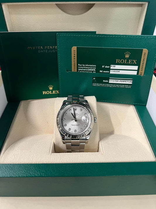 Rolex Datejust Silver Diamond Dial Fluted Bezel Osyter Bracelet Steel Watch 116334