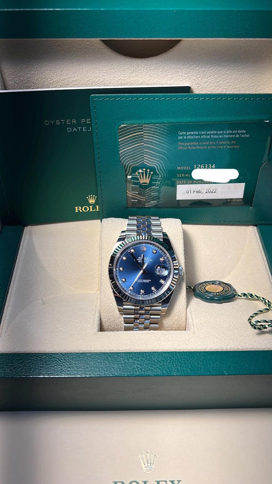 Rolex Datejust Blue Diamond Dial Fluted Bezel Jubilee Steel Watch 126334